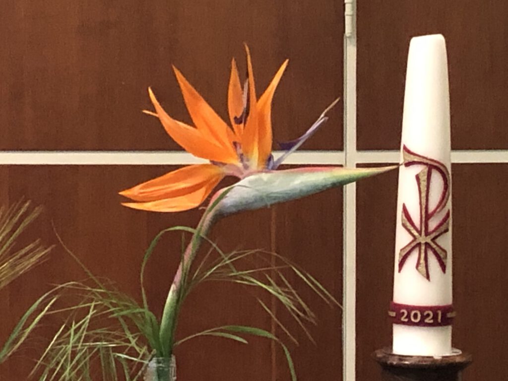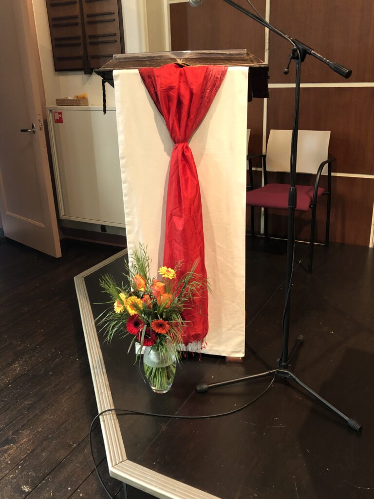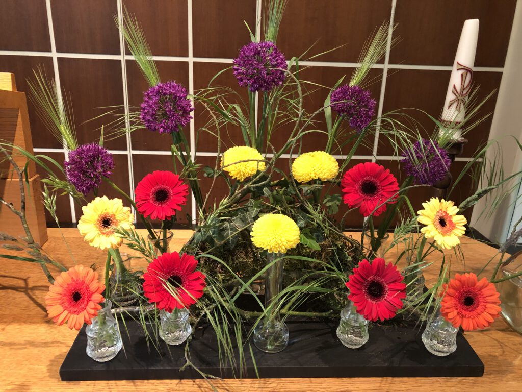 In de regenboogkleuren wordt Gods belofte zichtbaar in kleuren en vormen van bloemen de oranje en rode gerbera’s (leven, liefde, kracht, vuur).